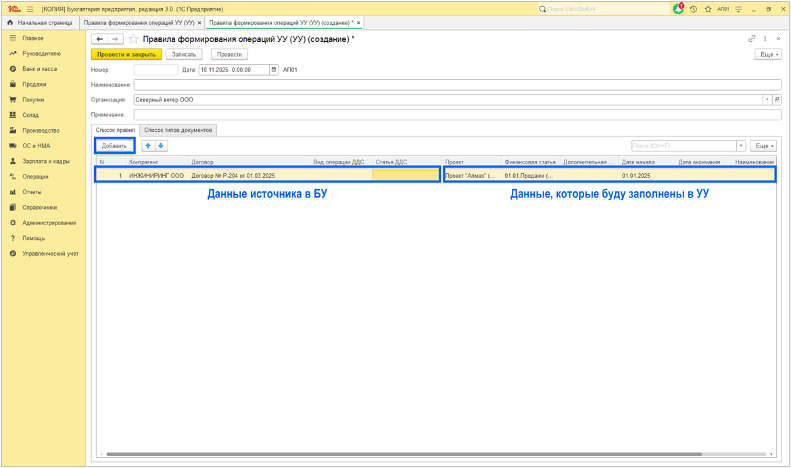 2) Создать документ «Правило формирования операций УУ» - в созданном документе добавить строку с правилом – Заполнить данные источника в БУ: Выбрать Контрагента (или Физическое лицо) - Выбрать договор – Далее заполнить данные, которые будут заполнены в УУ: Выбрать Проект – Выбрать Финансовую статью – Выбрать Дату начала (а если нужно ограничить действие правила, то выбрать Дату окончания).