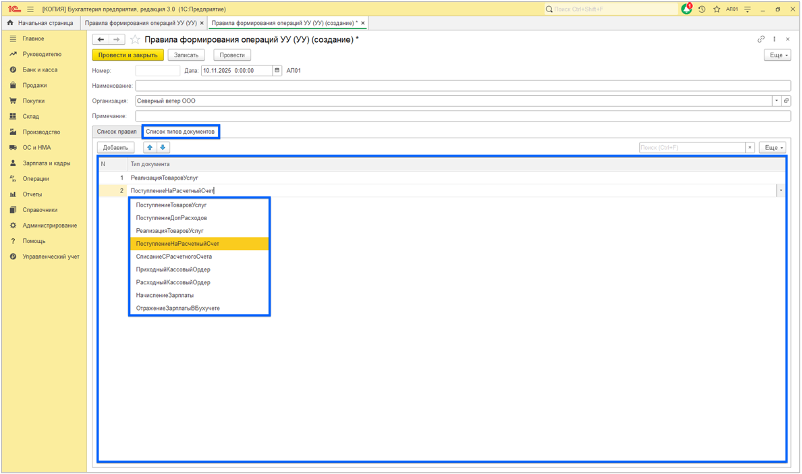 1) Выбрать раздел «Правила формирования операций УУ»