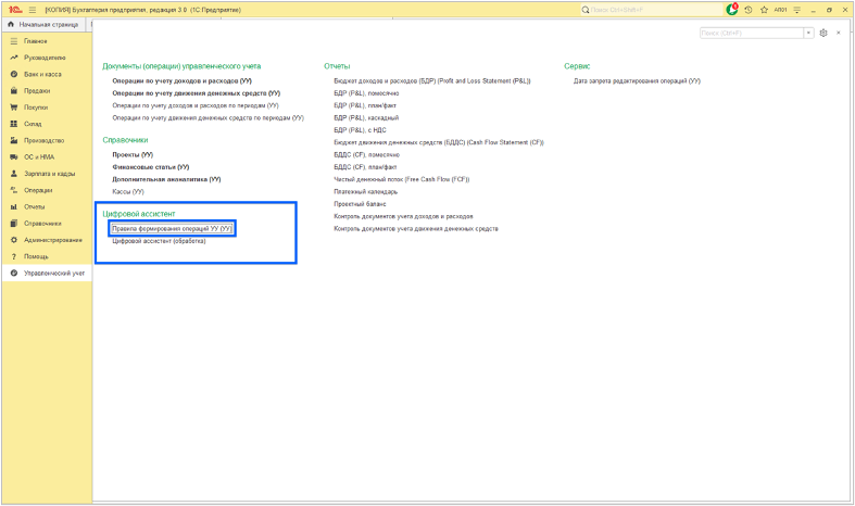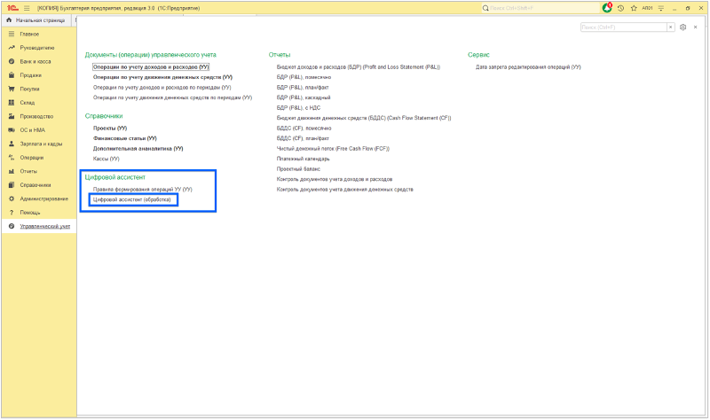 1.2. Подсистема 1С «Управленческий учет» сконфигурированная в формате Расширения* (Модуль УУ) содержит перечень инструментов для формирования Управленческой информации, представленной Отчетами УУ, сформированными на основании Документов УУ. При формировании Документов УУ используются управленческие аналитики (реквизиты), которые формируются с использованием соответствующих Справочников УУ. Модуль УУ содержит обработку «Цифровой ассистент», которая помогает обрабатывать часть документов автоматизировано.