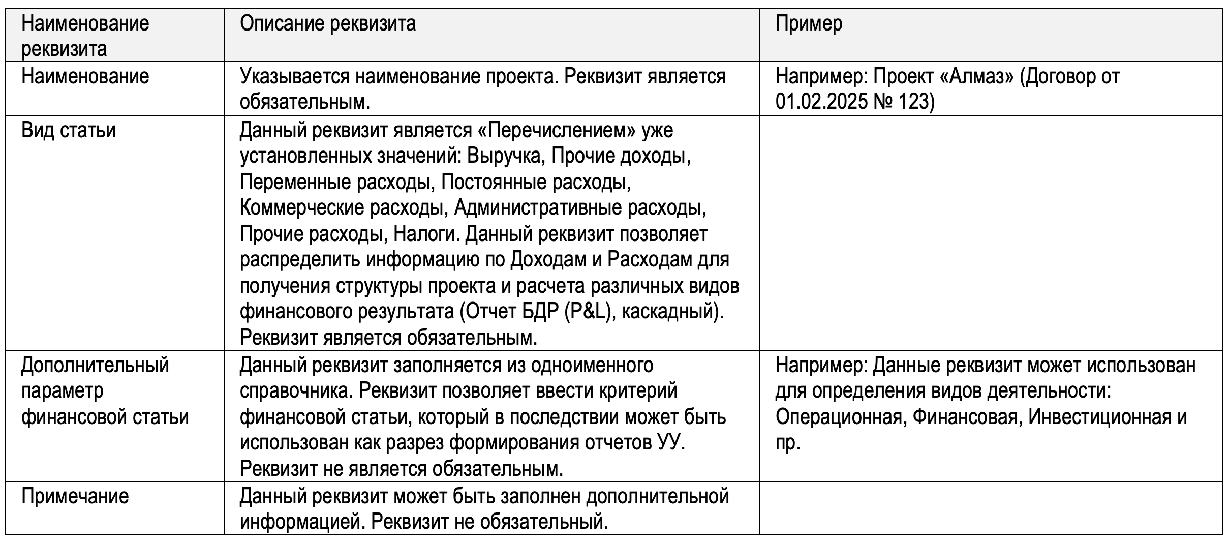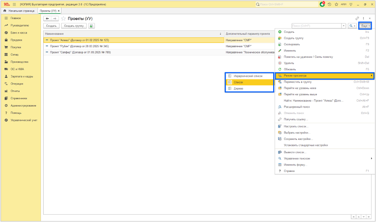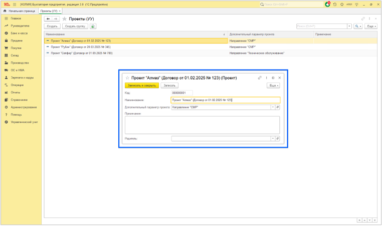 4.1.1. Справочник «Проекты» формирует объект учета, на который собирается информация о доходах, расходах и как следствие формируется финансовый результат по определенному проекту. Также собирается информация о движении денежных средств по данному проекту.