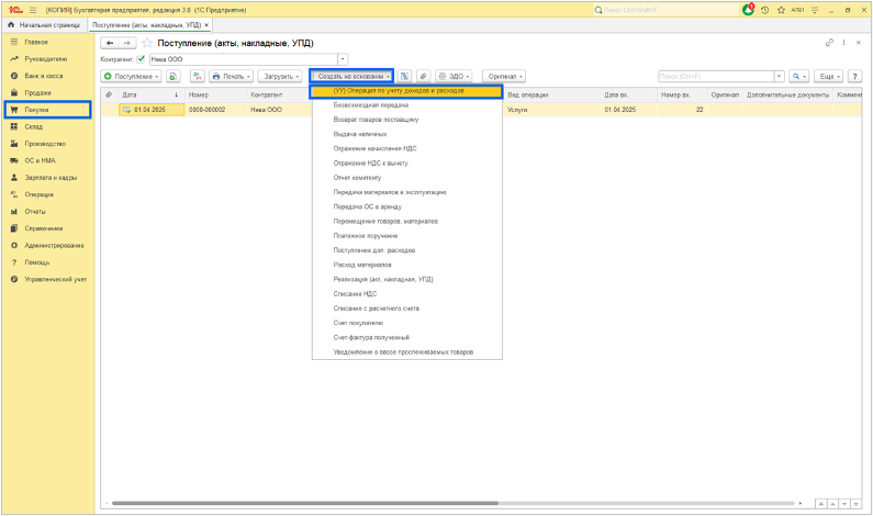 2) Из журнала документов. Например, в журнале «Покупки», встать на строку документа и нажать кнопку «Создать на основании» и выбрать «(УУ) Операция по учету доходов и расходов».