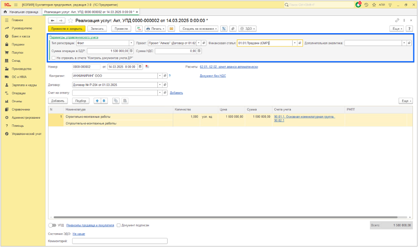 5.1.1. В документах БУ, указанных в п.1.4 предусмотрены параметры УУ (Тип регистрации, Проект, Финансовая статья и др.), которые могут быть заполнены непосредственно в документе БУ.