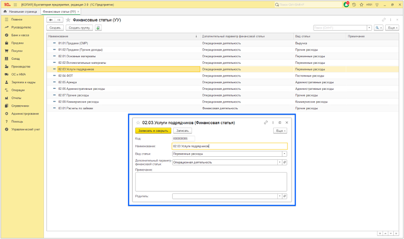 - Б.2. Формирование справочника «Финансовые статьи»,