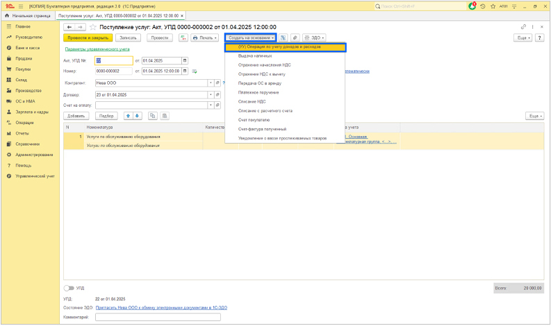 1) Из документа БУ. Нажать кнопку «Создать на основании» и выбрать «(УУ) Операция по учету доходов и расходов».